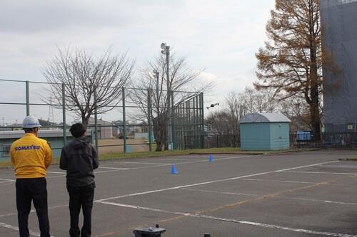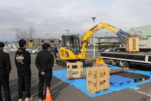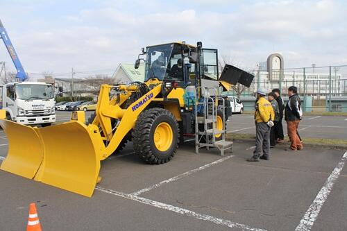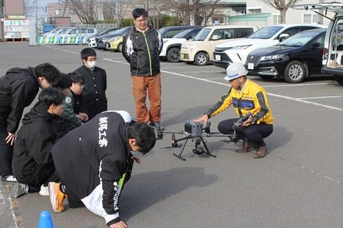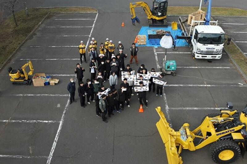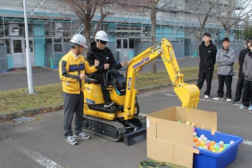 11月6日 電子機械科は独自に防災学校の取り組みを行っています。今年もコマツ道東株式会社様に御協力いただき、1年電子機械科を対象に防災出前授業を実施しました。1時間は出前授業として防災時に役に立つ重機などの講話をしていただきました。2・3時間は実際の重機等を運んでいただき、ミニショベルカーの運転、災害時のドローンの活躍、ホイールローダーの操縦方法、フォークアタッチメントのショベルの実機体験をしました。出前授業では初めてで知ることも多く、大変勉強になりました。最後はドローンによる記念撮影もしていただきました。御協力ありがとうございました。